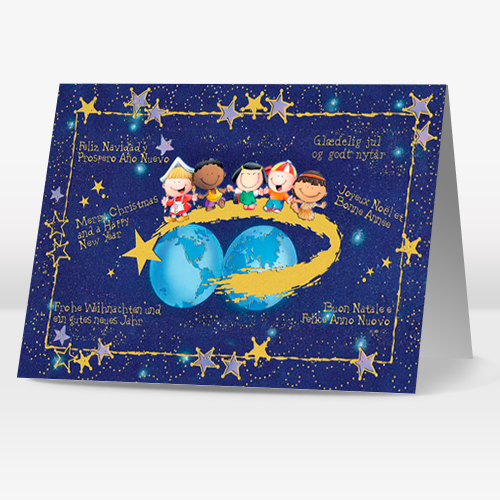 Dobbeltsidet julekort printet på 250gr glat ensidet bestrøget karton med let prægning og guld folie detaljer.