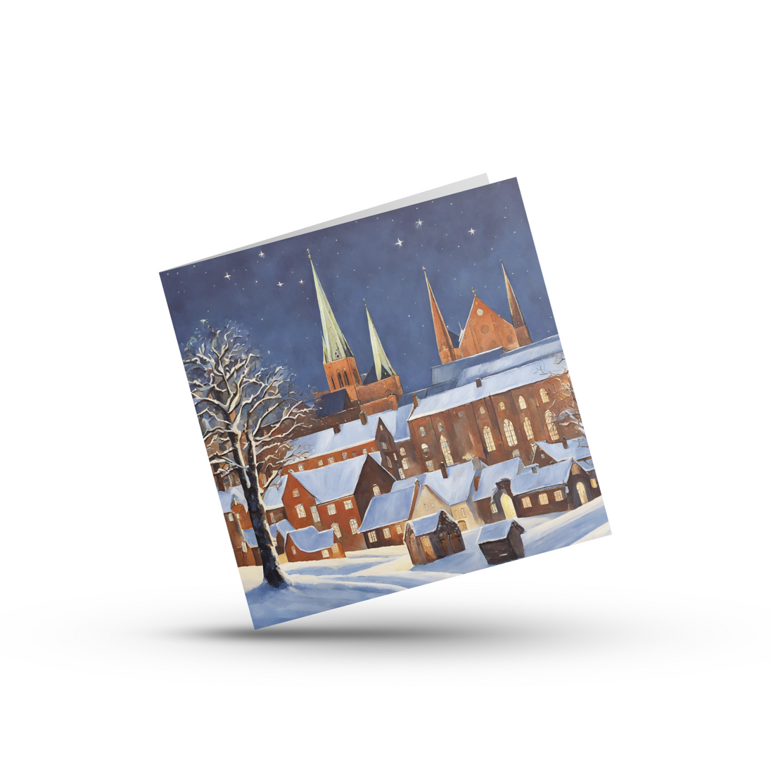 Julekortets motiv forestiller en snedækket by i et vinterlandskab, hvor tårnenes spir rækker op i vinternatten mod stjernerne.