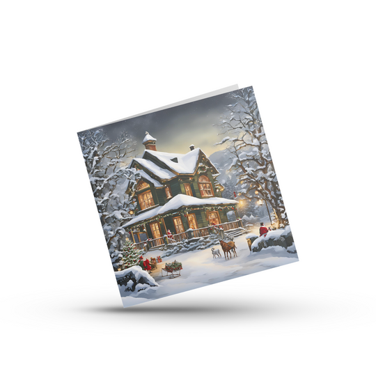 Julekortets motiv forestiller et snedækket hus i et vinterlandskab, hvor varmen fra lysene indenfor skinner ud af vinduerne og der gøres klar til julen udenfor. Det foldede kort måler 145x145mm Der medfølger én konvolut pr. kort....Normal pris 18,00 kr