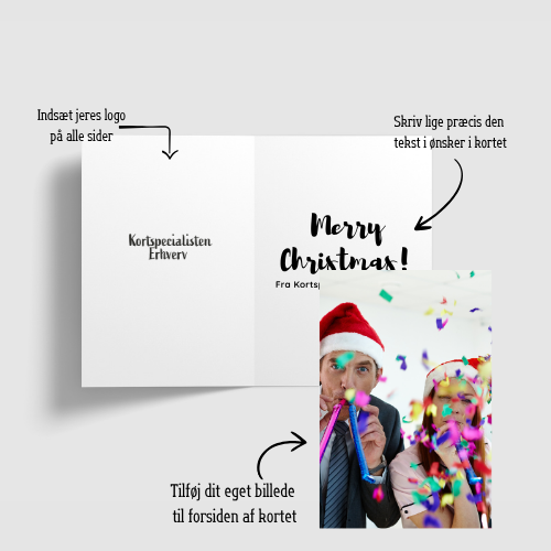 Du kan helt selv personliggøre dit kort i vores editor, hvor du kan tilføje din virksomheds logo til kortet, samt skrive din ønskede hilsen og/eller budskab.