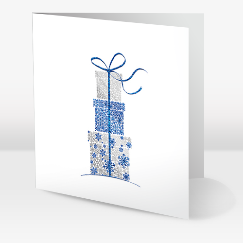 Dobbeltsidet julekort printet på 250gr mat struktureret karton med let prægning, samt blå og sølv folie detaljer.
