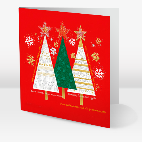 Et firmajulekort i ægte julefarver. Rød må siges for mange at repræsentere julen og derfor er julekortet med røde baggrunde det som mange forbinder med et 'rigtigt' julekort.