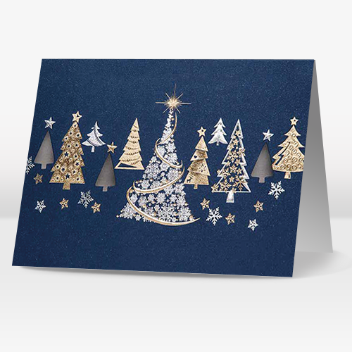 Dobbeltsidet julekort printet på 200gr mat struktureret marine blåt indfarvet karton med udskæringer af juletræer, samt guld og sølv folie detaljer. Der medfølger ét ark gulligt papirindlæg samt én konvolut pr. kort.Salgspris 15,00 krNormal pris 20,00 kr -